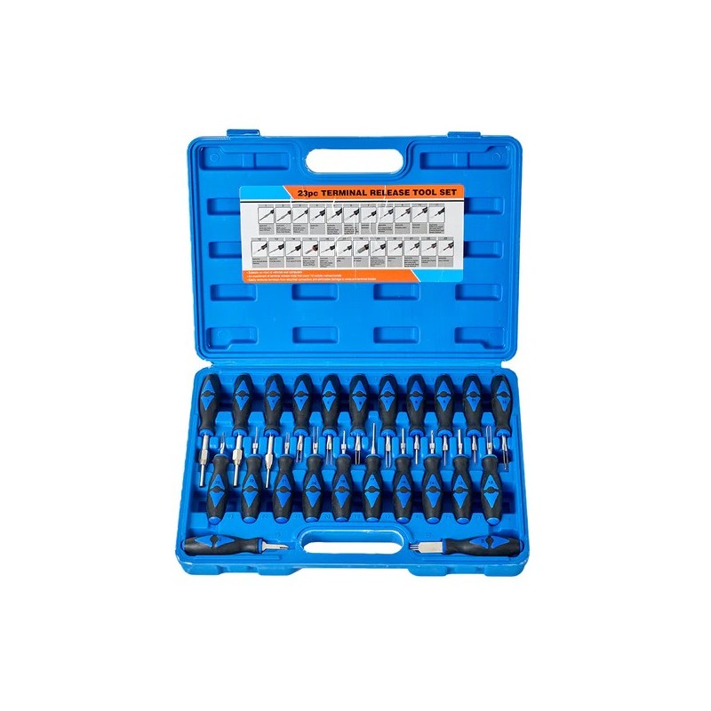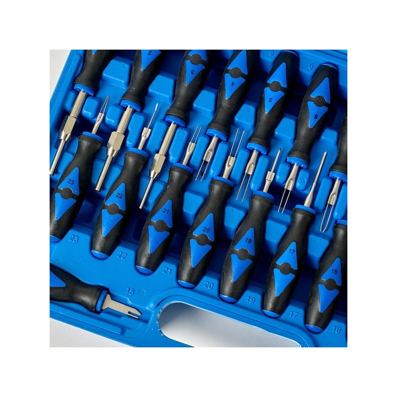 MQSSET23 es un conjunto de 23 piezas diseñado para extraer pines de conectores OEM utilizados en diversas marcas de automóviles.
