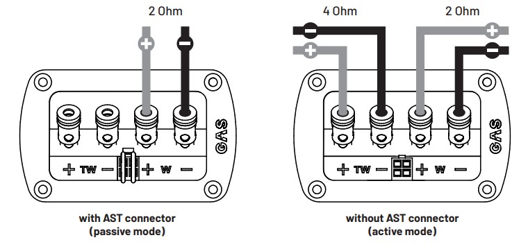 Al desconectar el conector AST del terminal del altavoz, se pueden conectar amplificadores separados: uno para los altavoces de medios y otro para los tweeters.