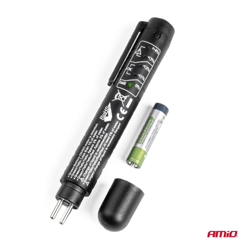 Para probar la calidad del líquido, encienda el dispositivo con el botón en la parte superior, como en un bolígrafo. Luego retire la cubierta inferior y coloque la punta del probador (dos pines) en el depósito de líquido de frenos.