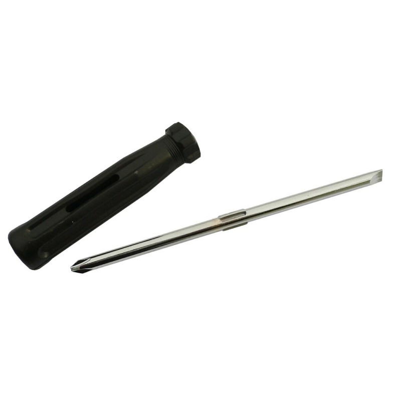El destornillador tiene una punta plana y una Phillips en cada extremo del mango extraíble.