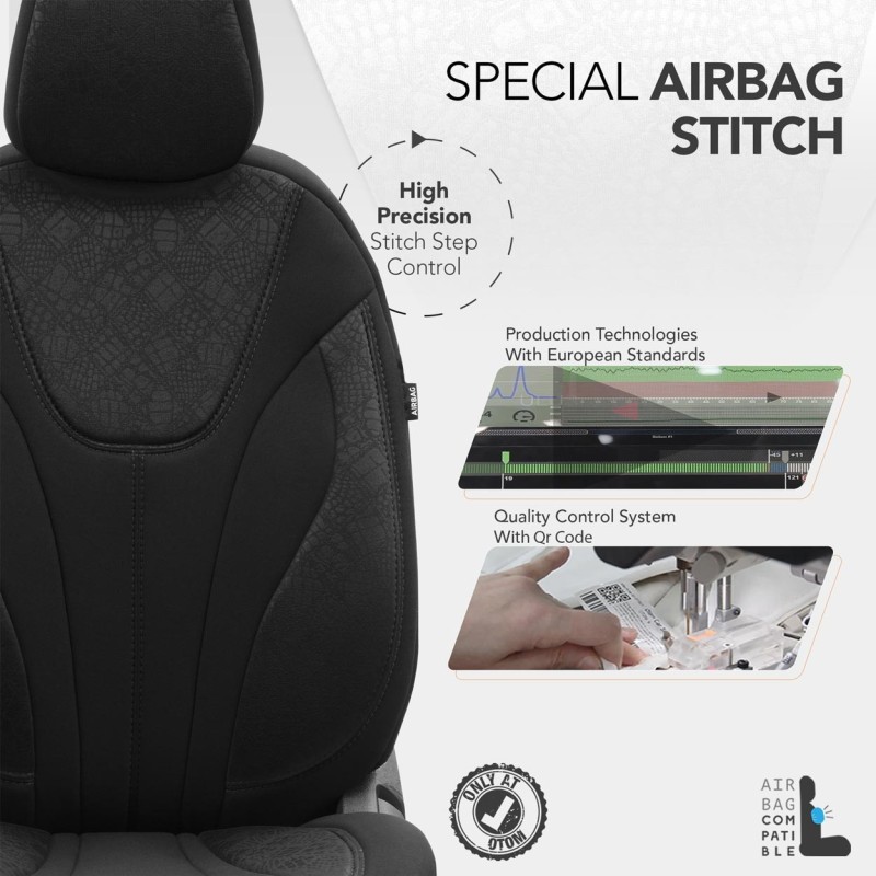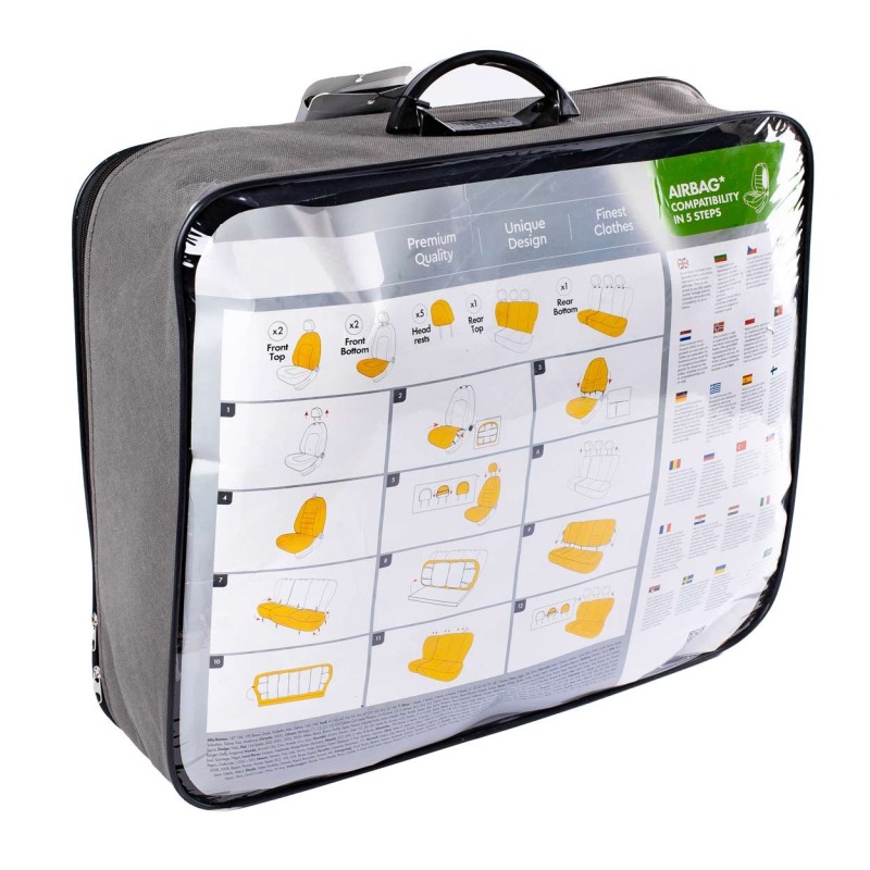 Las fundas tienen una costura certificada AIRBAG de serie, lo que las hace aptas para los coches con airbags laterales en los asientos y los asientos estándar. Gracias a la costura especial, cubren completamente los asientos sin interferir con los AIRBAGs.