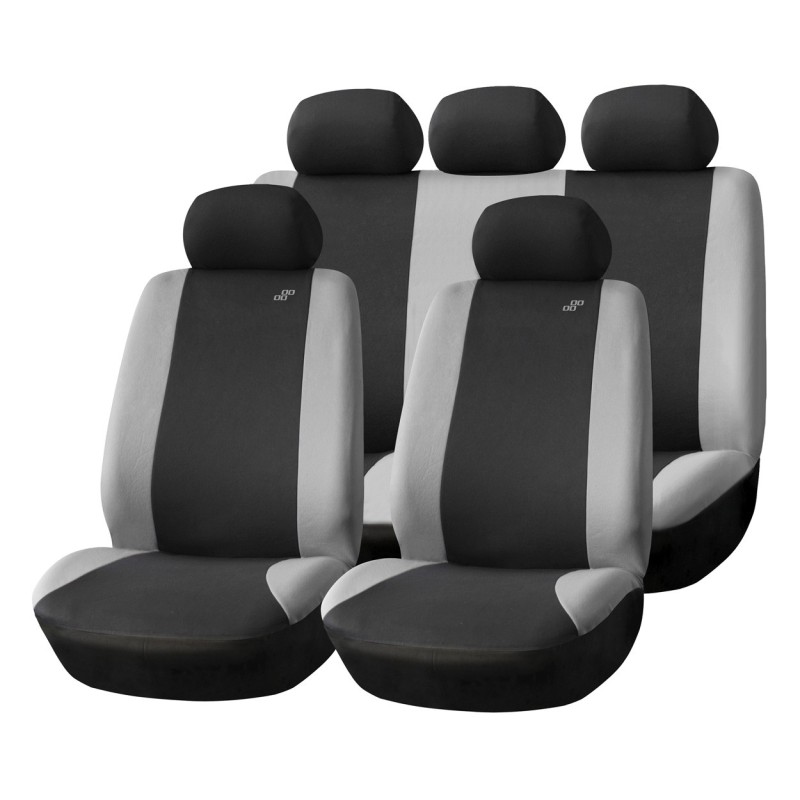 El juego de 9 piezas incluye fundas para dos asientos delanteros, un asiento trasero dividido y un juego de reposacabezas.