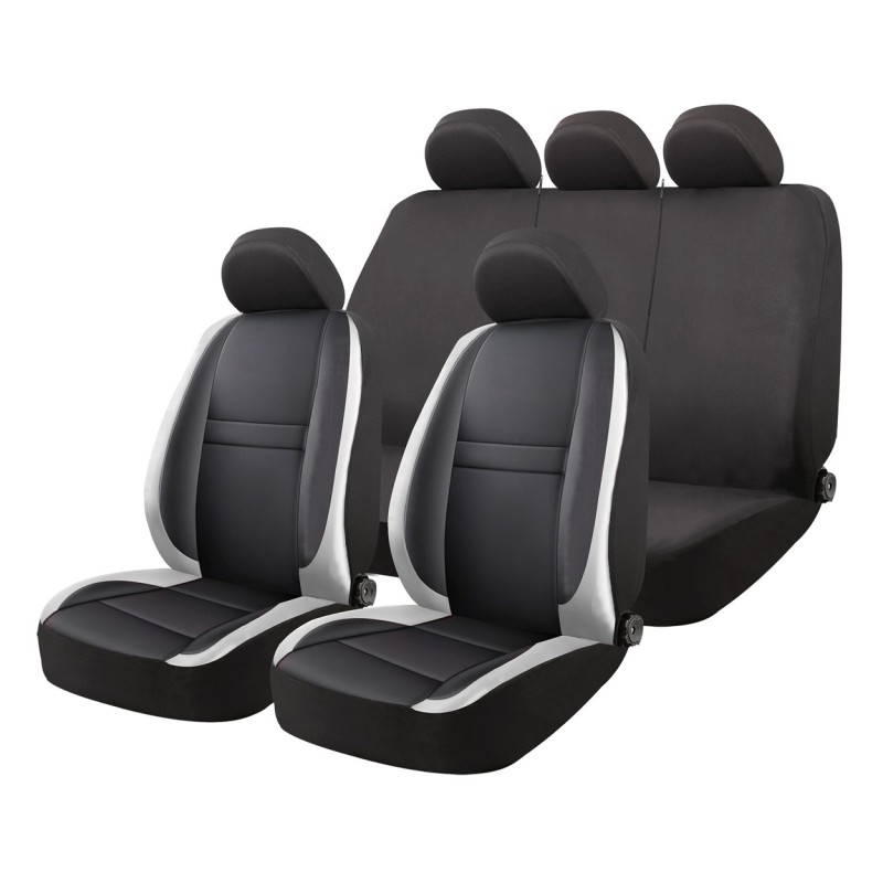 El juego de 9 piezas incluye fundas para dos asientos delanteros, un asiento trasero dividido y un juego de reposacabezas.