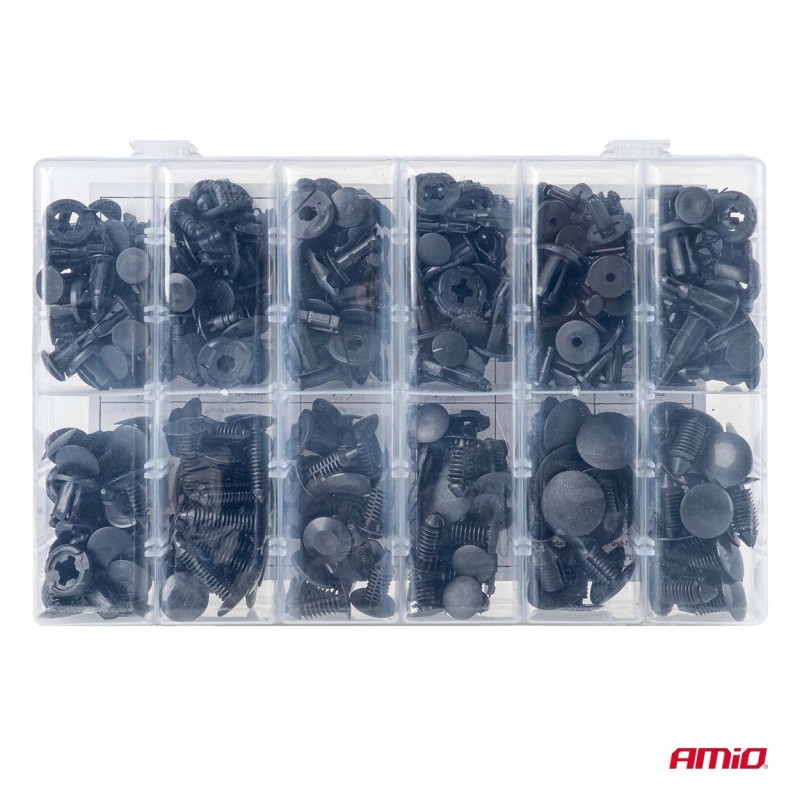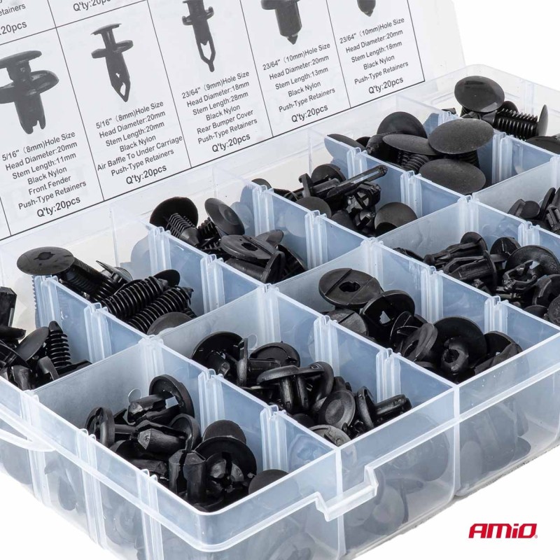 Contiene una gran variedad de clips, grapas y pasadores que permiten fijar de forma segura y precisa paneles de carrocería, molduras, cubiertas de plástico y otros elementos de la carrocería.