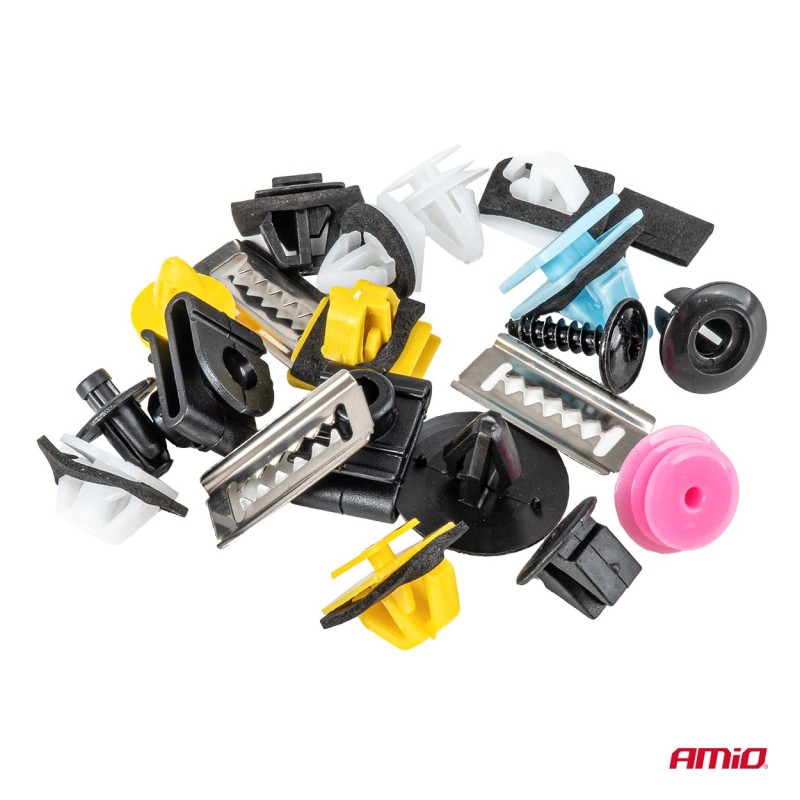 Contiene diversos clips, grapas y pasadores que permiten fijar de forma segura paneles de carrocería, molduras, cubiertas de plástico y otros elementos de la carrocería.