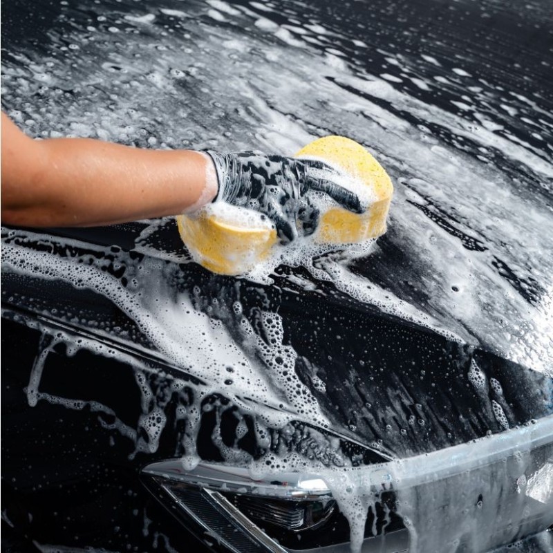 Lave el coche con la solución utilizando una esponja o un cepillo suave.