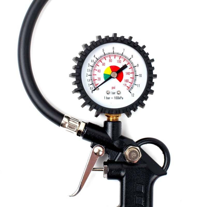 El inflador de ruedas neumático con manómetro es una herramienta esencial para cualquier taller. El arma es cómoda, ligera, práctica y estéticamente agradable. La pistola tiene una válvula de escape de aire y una cubierta de goma para el manómetro.