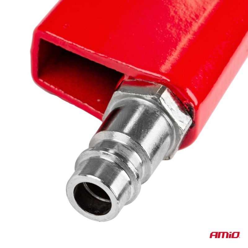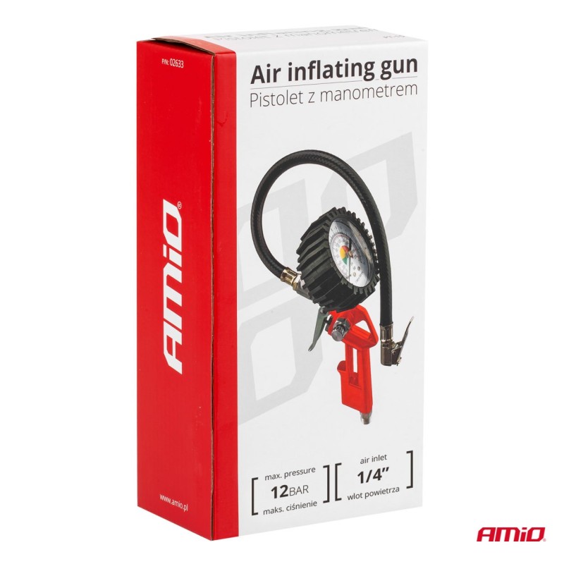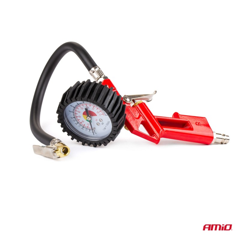 La pistola está equipada con un manómetro mecánico de gran tamaño, para que el resultado de la medición sea claro. El manómetro posee dígitos grandes y claros, y un indicador grande que nos permiten leer rápidamente y correctamente el resultado de la presión en el neumático. El dispositivo tiene una carcasa de goma, gracias a la cual amortigua los posibles impactos y protege el manómetro de los daños.