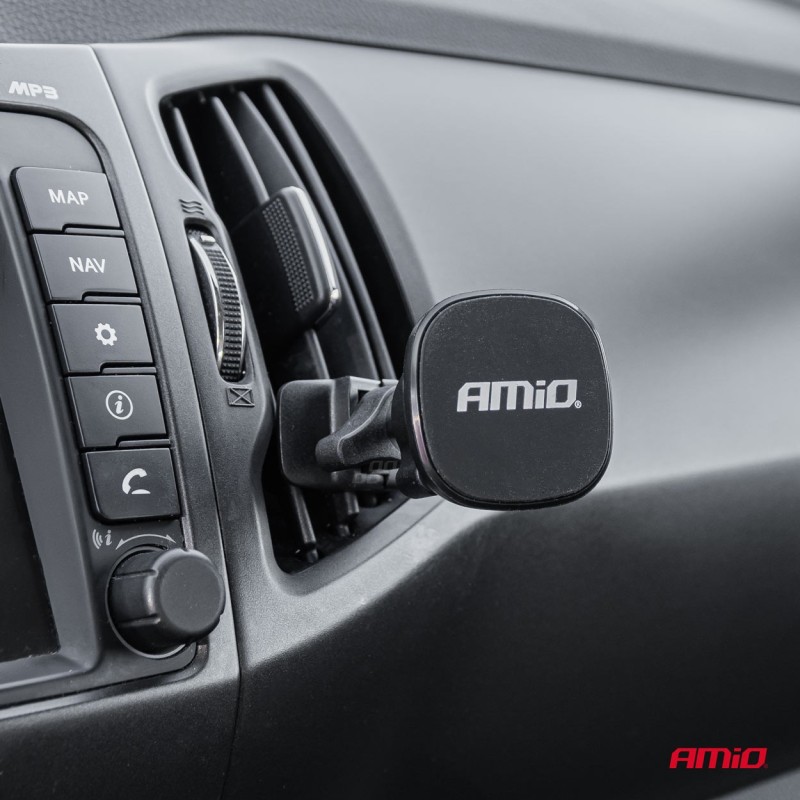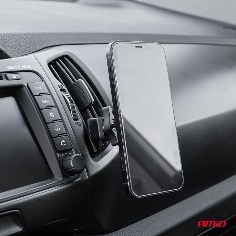 Este avanzado producto cuenta con un potente imán y un brazo para montarlo en las rejillas de ventilación del coche con capacidad de giro.