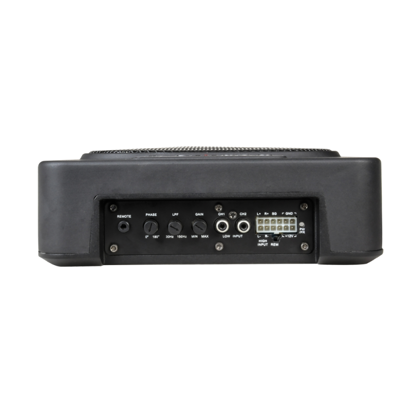 Esta caja cuenta con un subwoofer de 9” 250W RMS y 2 radiadores laterales pasivos que potencian los graves internos del vehículo. Posee amplificador clase D que asegura bajo consumo de energía, ajustes de fase y ajustes de corte de frecuencia desde 30Hz a 150Hz.